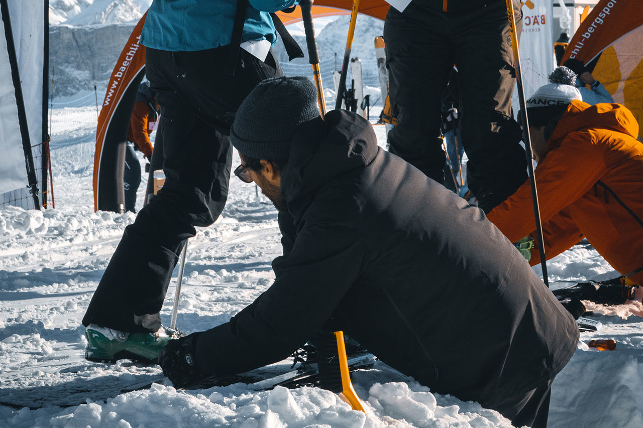 Nach ein wenig Quatschen und dem «registrieren» geht es schon auf zur ersten Skimarke. Ich wähle den Black Crows und werde sogleich nett beraten. Mit dem Ski in den Händen geht’s weiter zu dem speziell angefertigten Hügel für die Einstellung der Bindung. Hier helfen wieder zahlreiche Bächli Mitarbeiter sogar solchen (eigentlich Snowboarder) wie mir, mit dem Einstieg in die