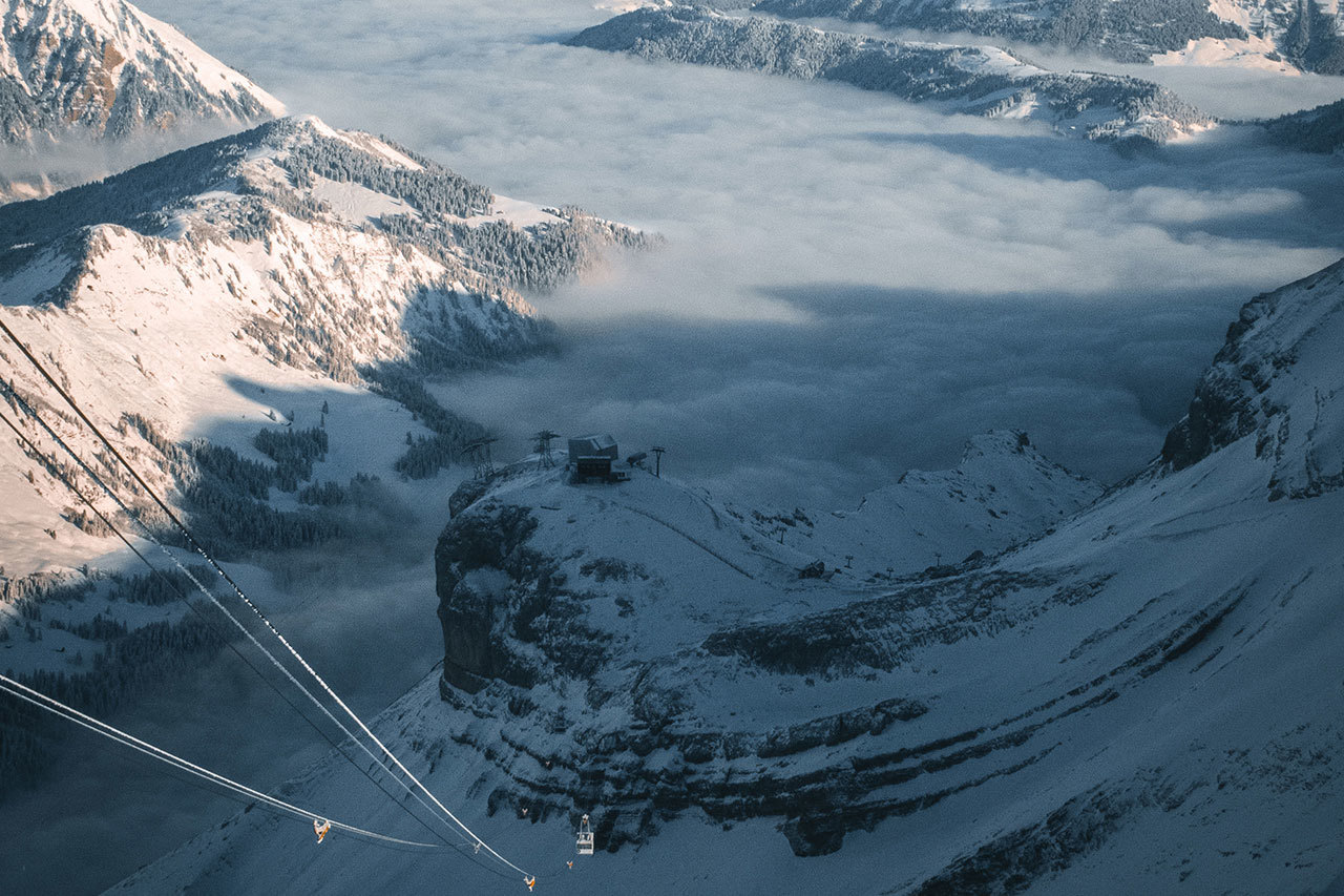 Schon während der Gondelfahrt ins Skigebiet Glacier 3000 merkte man, dass es nur das Flachland war, welches dem düsteren Wetter trotzdem musste. Wir konnten das atemberaubende Alpenpanorama inklusive Nebelmeer geniessen. Der Ski sind noch nicht mal angezogen und schon ist die Vorfreude auf den zwar nicht üppig vorhanden, jedoch umso besseren Schnee riesig. Nach einer Bächli-typischen freundlichen Begrüssung folgt eine kurze Abfahrt Richtung Testgelände und schon das nächste Highlight. Überall hat es Behälter mit Snickers, Mars und weiteren Schoggiriegel! Spätestens jetzt ist der Rest der Familie neidisch, dass sie nicht auch gekommen sind…