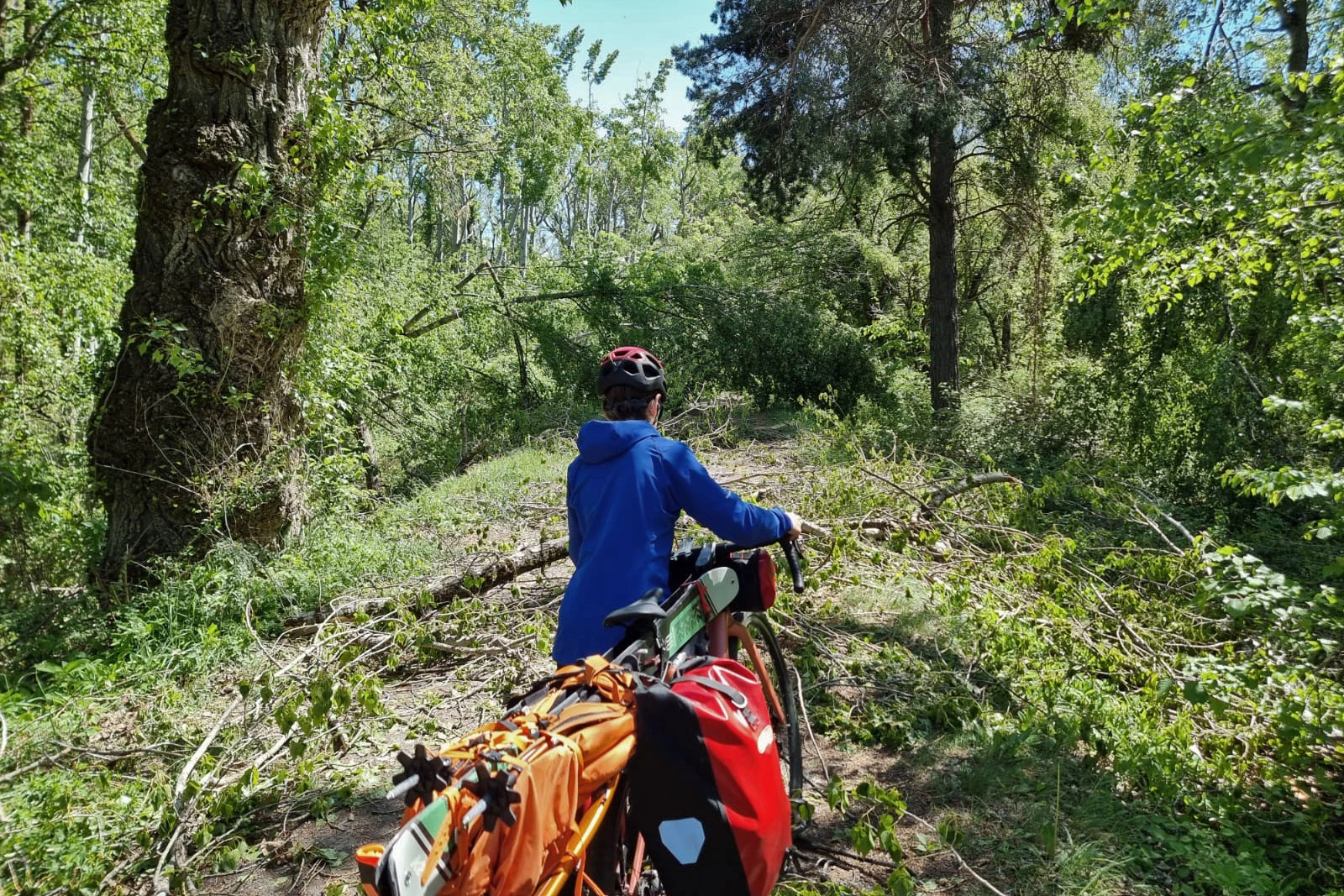 A Gampel, nous avons cherché sur la carte la piste cyclable en direction de Viège. Lorsque nous l'avons enfin trouvée, l'aventure a vraiment commencé. Quelques jours auparavant, il avait neigé abondamment dans la région. Sous le poids de la neige, de nombreux arbres étaient tombés sur le chemin et les chemins n'avaient pas encore été nettoyés. Au début, nous pensions que les choses allaient s'améliorer, mais nous nous sommes trompés.
