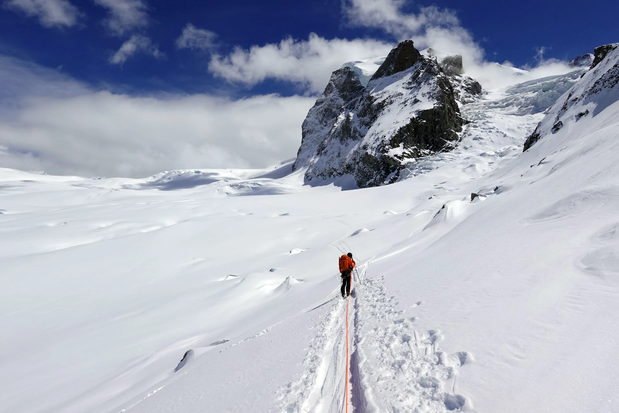 La météo du matin étant très bonne, nous sommes partis à 05h50 en direction du point de décision. Nous avons bien progressé, après avoir parcouru les 1000 premiers mètres de dénivelé et être restés au soleil, nous avons fait une petite pause Ensuite, nous avons continué à monter et avons décidé de garder notre objectif initial : monter à la pointe Dufour Nous avons donc continué à monter jusqu'au dépôt de skis à 4‘356m. Nous avons monté nos crampons sur nos chaussures de ski, pris le piolet en main et nous sommes encordés de manière à marcher sur la corde courte.