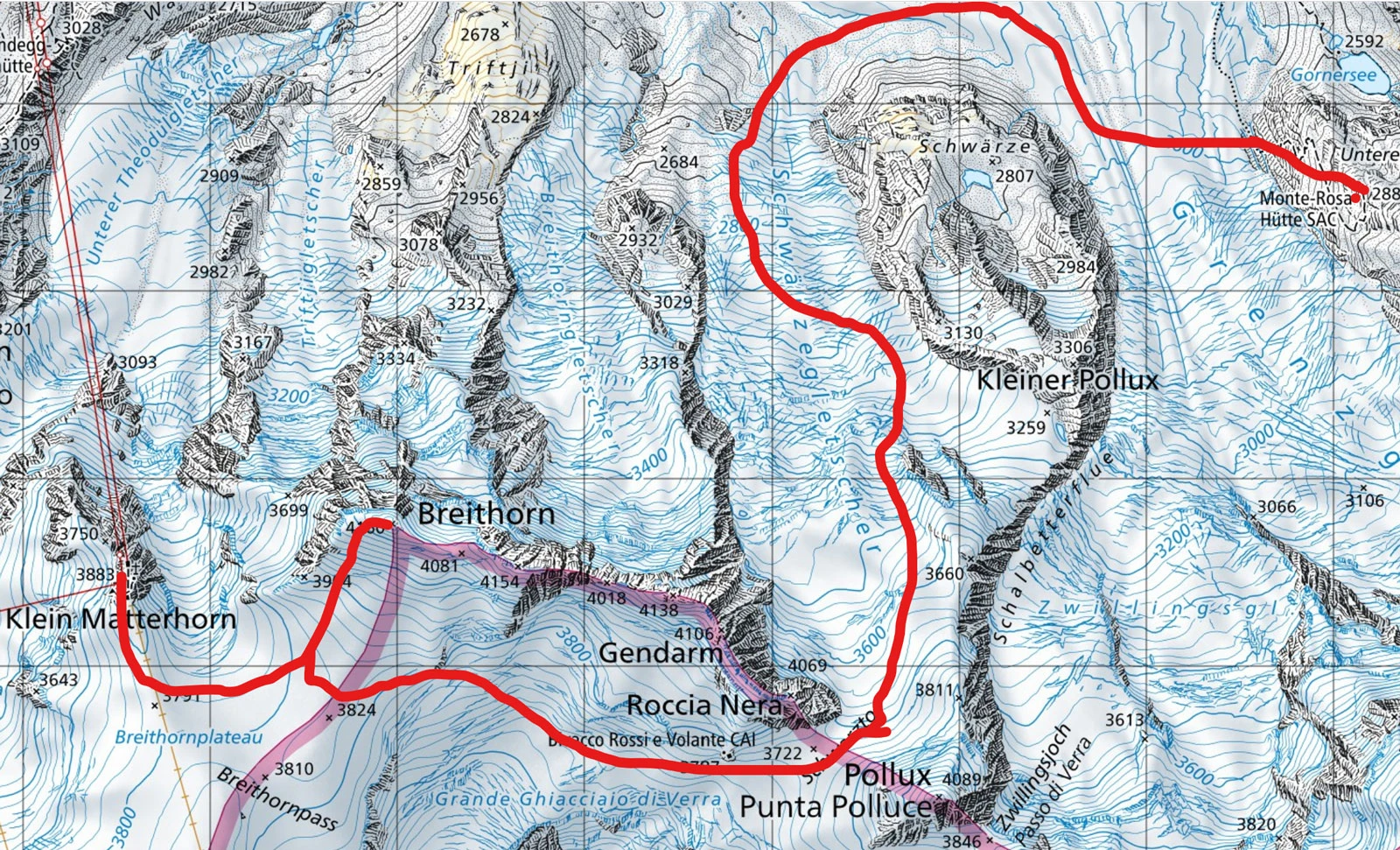 Le soleil a malheureusement vite disparu, remplacé par de la neige. Lorsque nous avons atteint le sommet du Breithorn (4‘164 MüM) après 1h et 32min, la bonne visibilité était définitivement terminée. La descente en direction du Schwarztor ne pouvait être trouvée qu'avec une carte et un GPS (montre et téléphone portable). Comme il venait de neiger et que l'ancienne trace était recouverte, j'ai dû tracer et naviguer. C'était une nouvelle expérience passionnante pour moi.