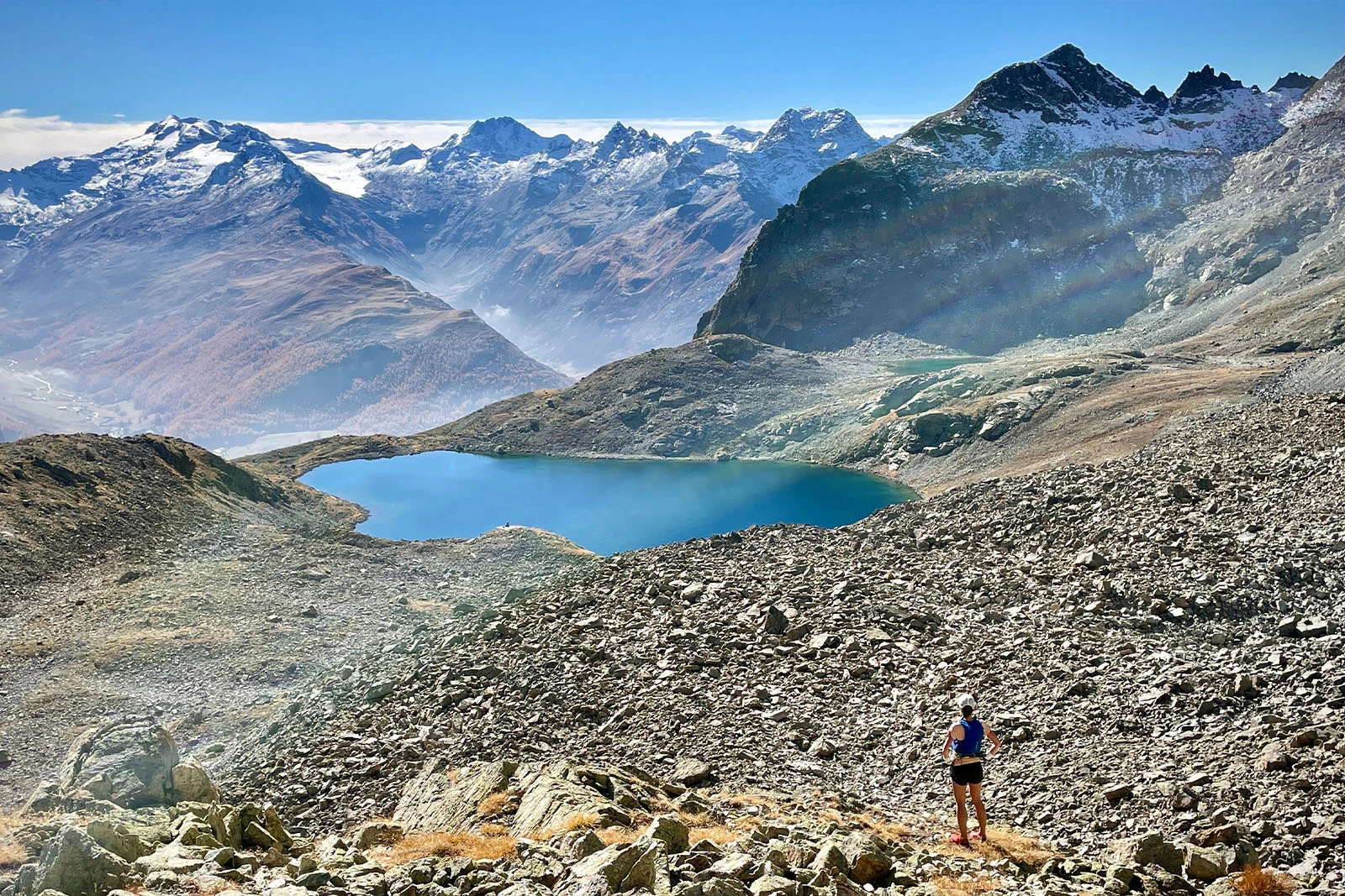 Tu marches dans le sens des aiguilles d'une montre de Silvaplana jusqu'à la bifurcation à P.1862 le long de la Via Engiadina (bon warmup trail). De là, la montée est raide et continue sur 750 m jusqu'au Lej da la Tscheppa scintillant. Tu quittes le chemin de randonnée et tu t'orientes à partir de maintenant grâce aux cairns, afin de traverser d'abord le grand champ de blocs au bord et de gagner ensuite la Fuorcla Polaschin en ménageant le plus possible tes forces par des traces de sentier.