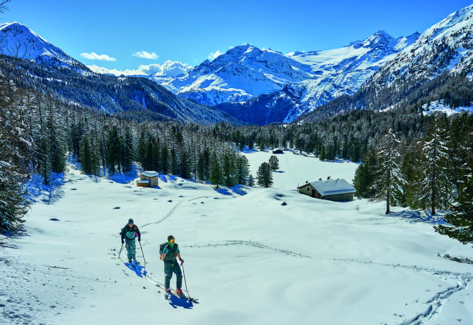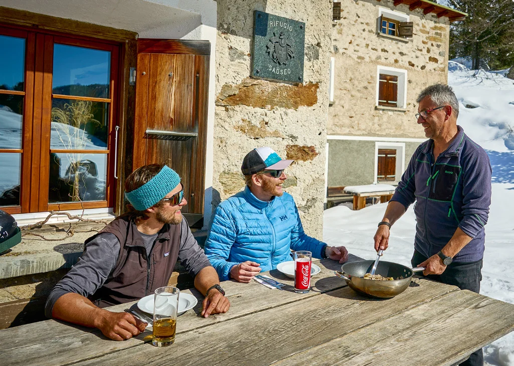 «Tous les ingrédients sont locaux» ;, dit Gigi, lorsqu'il se rend au restaurant le lendemain de son départ ;Le lendemain, après le tour de la Cima di Cardan (sur l'arête sud du Piz Ursera), il sert une énorme poêle de pizzoccheri de Poschiavo avec du fromage, des pommes de terre et des légumes sur la terrasse de l'auberge. Juste ce qu'il faut. Car après le tour, c'est avant le tour. Le soleil est encore haut dans un ciel sans nuages, et Luggi et Florian font le plein d'énergie pour un deuxième itinéraire l'après-midi vers les collines öà l'est de la hutte sous la Punta dal Dügüral. «Parfait» ; sourit Florian en montant. La forêt de pins clairsemée à l'ombre a conservé une neige poudreuse très profonde. La région se prête également à de petites randonnées les jours de mauvais temps avec du white out en altitude, tout comme la randonnée vers le Motal voisin (2517 m).