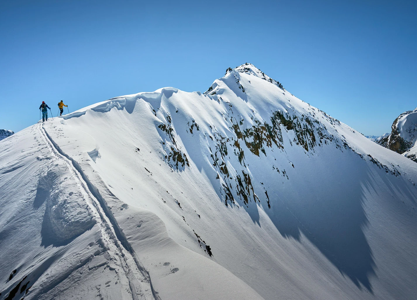 Florian et Luggi, eux, apprécient la neige et la météo. Quel bienfait lorsque, sur le haut plateau de Plan da la Genzana, le soleil envoie enfin ses premiers rayons üsur la crête. Comme si quelqu'un avait actionné un interrupteur invisible, quelques minutes plus tard, le vent s'arrête également. On peut enfin profiter de la randonnée. Une fois de plus, l'ascension du Piz Cunfin, côté sud, offre des vues grandioses sur des couloirs sauvages – cette fois sur les flancs nord du Corno di Dosse (3232 m). Le temps a été très favorable. Südseitig, la neige fraîche des jours précédents s'est maintenant bien tassée. «Un névé parfait» ; estime Luggi après un bref test. Et c'est ainsi que nous descendons rapidement, mais comme sur du velours, le flanc raide du Piz Cunfin.