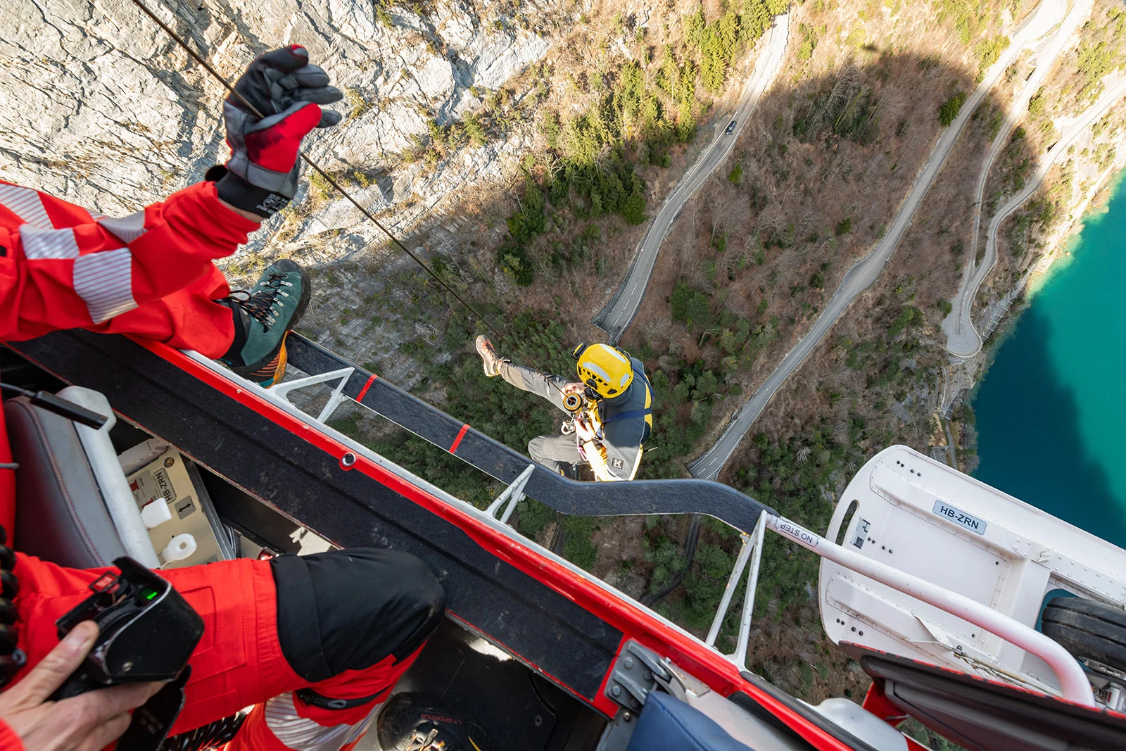 Par exemple, partons de deux grimpeurs bloqués et en hypothermie : Après avoir évalué la situation, nous décidons de nous poser à proximité, sur une aire d'atterrissage intermédiaire, par exemple une prairie alpine, et d'y décharger le matériel non nécessaire ainsi que le médecin. L'hélicoptère dispose ainsi de plus de puissance. L'opérateur du treuil dans l'hélicoptère me fait alors descendre avec le treuil de sauvetage avec précision jusqu'aux deux patients de la via ferrata. Dès que je suis en contact avec le rocher, je m'assure et décroche le crochet du treuil pour que l'hélicoptère soit à nouveau libre.