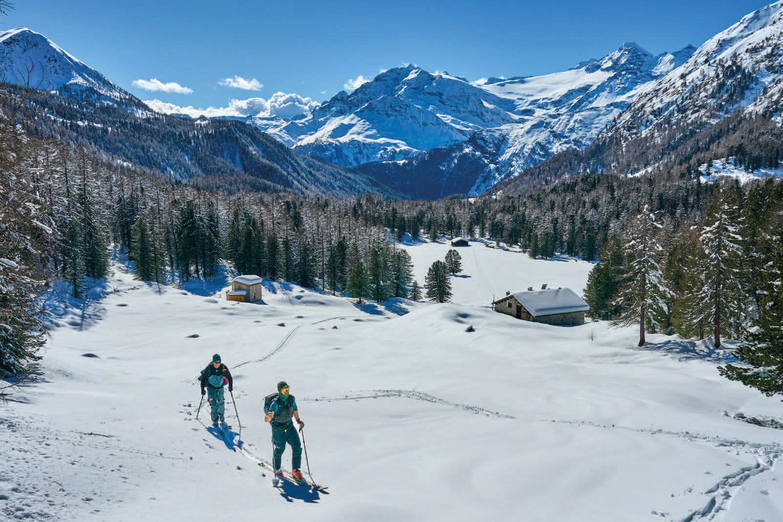 Le lendemain, de retour de la Cima di Cardan (crête menant au Piz Ursera), Gigi s’exclame : « Que des ingrédients locaux », tout en servant une énorme poêlée de pizzoccheri de la vallée de Poschiavo accompagnés de fromage, de pommes de terre et de légumes sur la terrasse de la cabane. Exactement ce qu’il faut. Car après la rando, c’est aussi avant la rando. Le soleil brille encore haut dans un ciel sans nuages, et Luggi et Florian reprennent des forces pour une deuxième randonnée l’après-midi en direction des pentes à l’est du refuge, sous la Punta dal Dügüral. « Tout est parfait », sourit Florian pendant la montée. La forêt de mélèzes clairsemée et ombragée a conservé une neige poudreuse qui arrive à hauteur des hanches. Même par mauvais temps, lorsque le brouillard recouvre les sommets en altitude, cette région se prête bien à des petites randonnées, comme celle qui mène au Motal (2517 m).