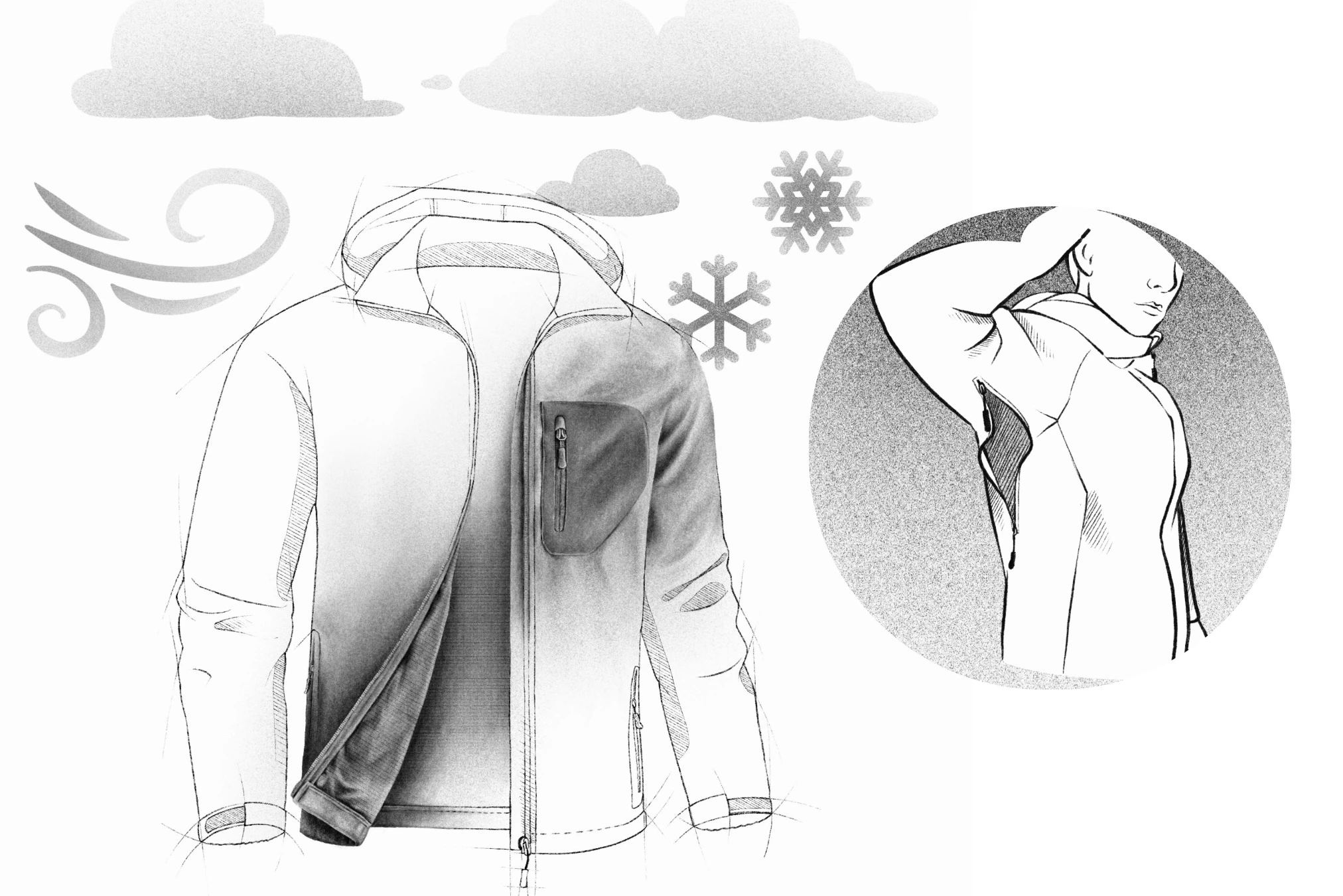 L’histoire des softshells commence dans les années 1990. L’idée était de créer un matériau alliant confort, respirabilité et une certaine protection contre le vent et l’humidité. La liberté de mouvement devrait également être assurée avec pour objectif de combler le fossé entre les hardshells imperméables et coupe-vent, mais plutôt rigides, et les polaires souples, mais laissant passer le vent. La philosophie des pionniers (par exemple Malden Mills, aujourd’hui Polartec ; Schoeller, Arc’teryx et Mammut) était aussi simple que révolutionnaire : autant de protection contre les intempéries que nécessaire et autant de respirabilité que possible. Aujourd’hui, avec la large gamme de vestes isolantes, hybrides et autres, il n’est plus si facile de formuler une définition claire des softshells.